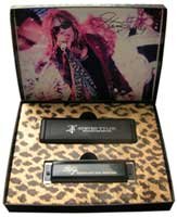 Hohner Inc is proud to announce the release of a truly unique instrument, the Steven Tyler Signature Series Harmonica. Steven Tyler has worked with Hohner Inc. to design a Harmonica to his exact specifications featuring a custom combination of a premium reed plate, custom tuning, a special wood comb, and black & silver styling. The Signature Series Harmonica is shipped in a specially stylized gift box, including a carrying case, and a signed photo of Steven Tyler. This harmonica replicates the exact instrument that Steven plays in performance. It is built to maximize responsiveness and note bending capability, and produces a strong, full tone when played in high energy, high volume context. It is in the key of A only, which translates to the key of E on a guitar, (which is the favorite key of all guitarists).